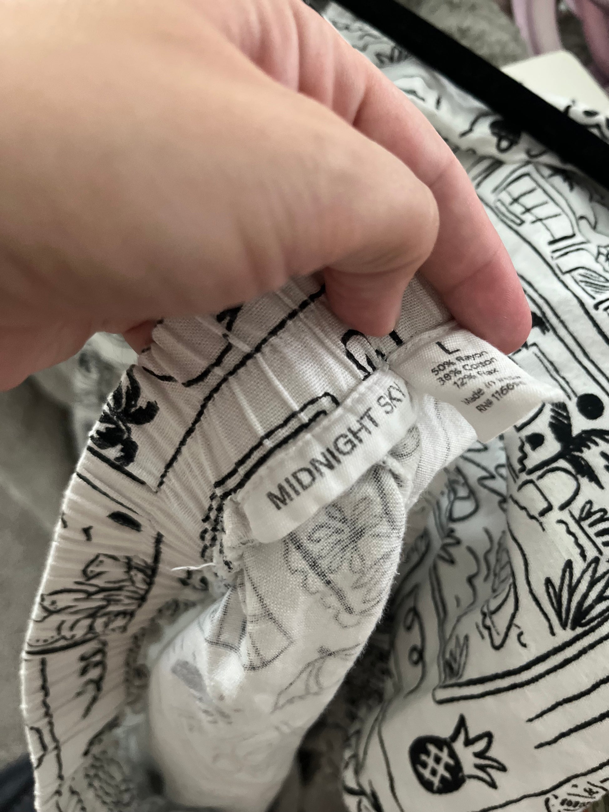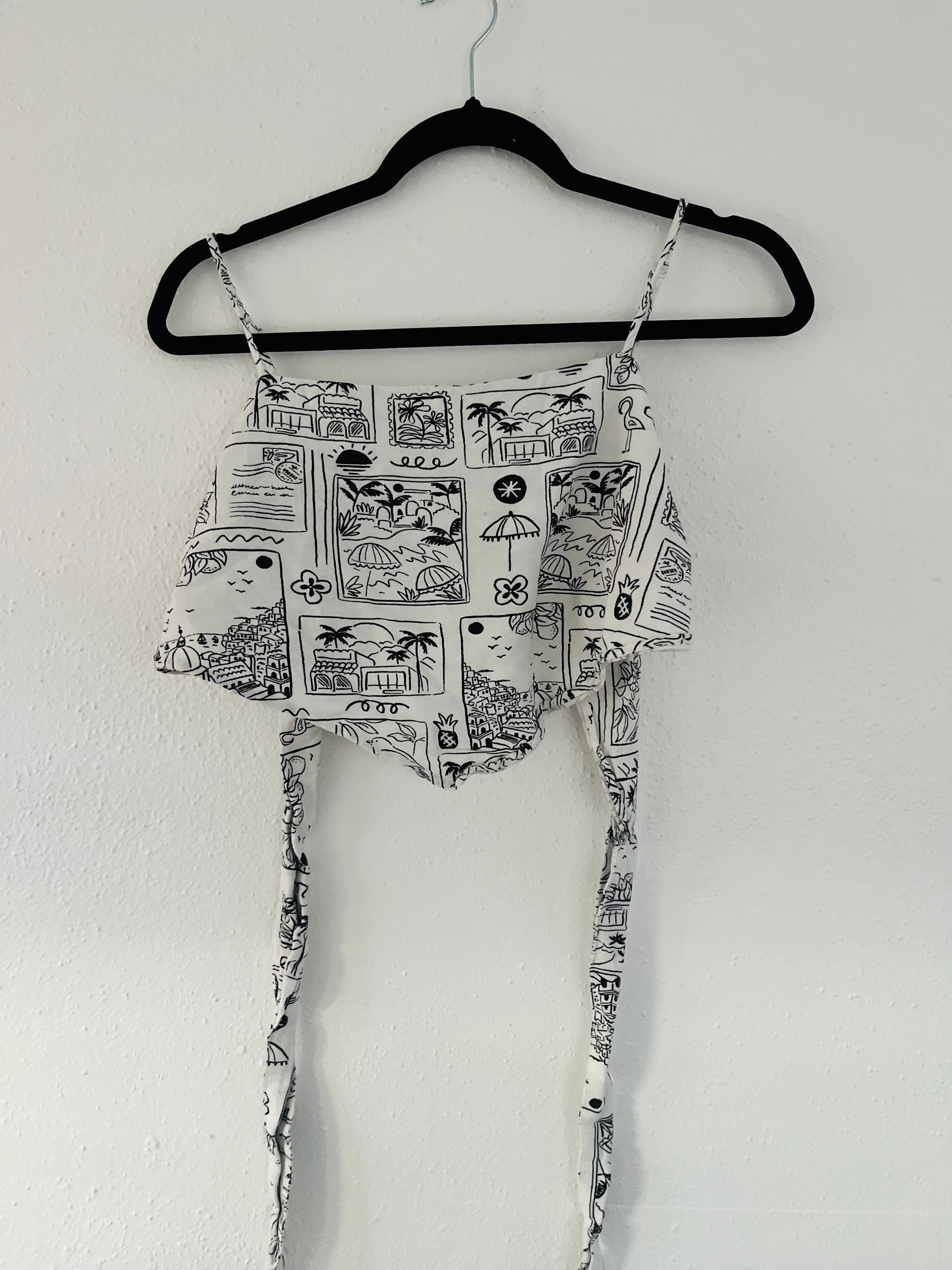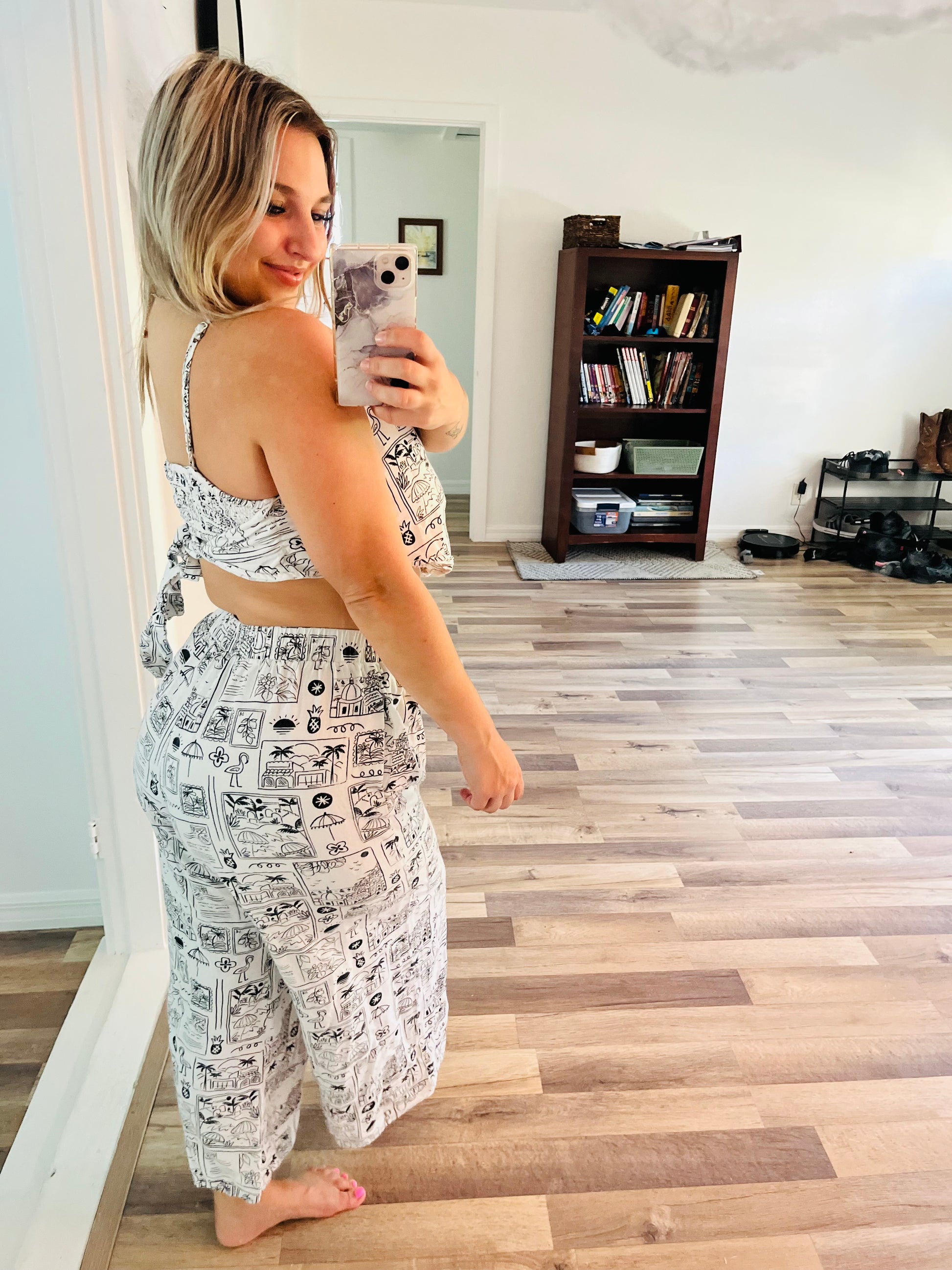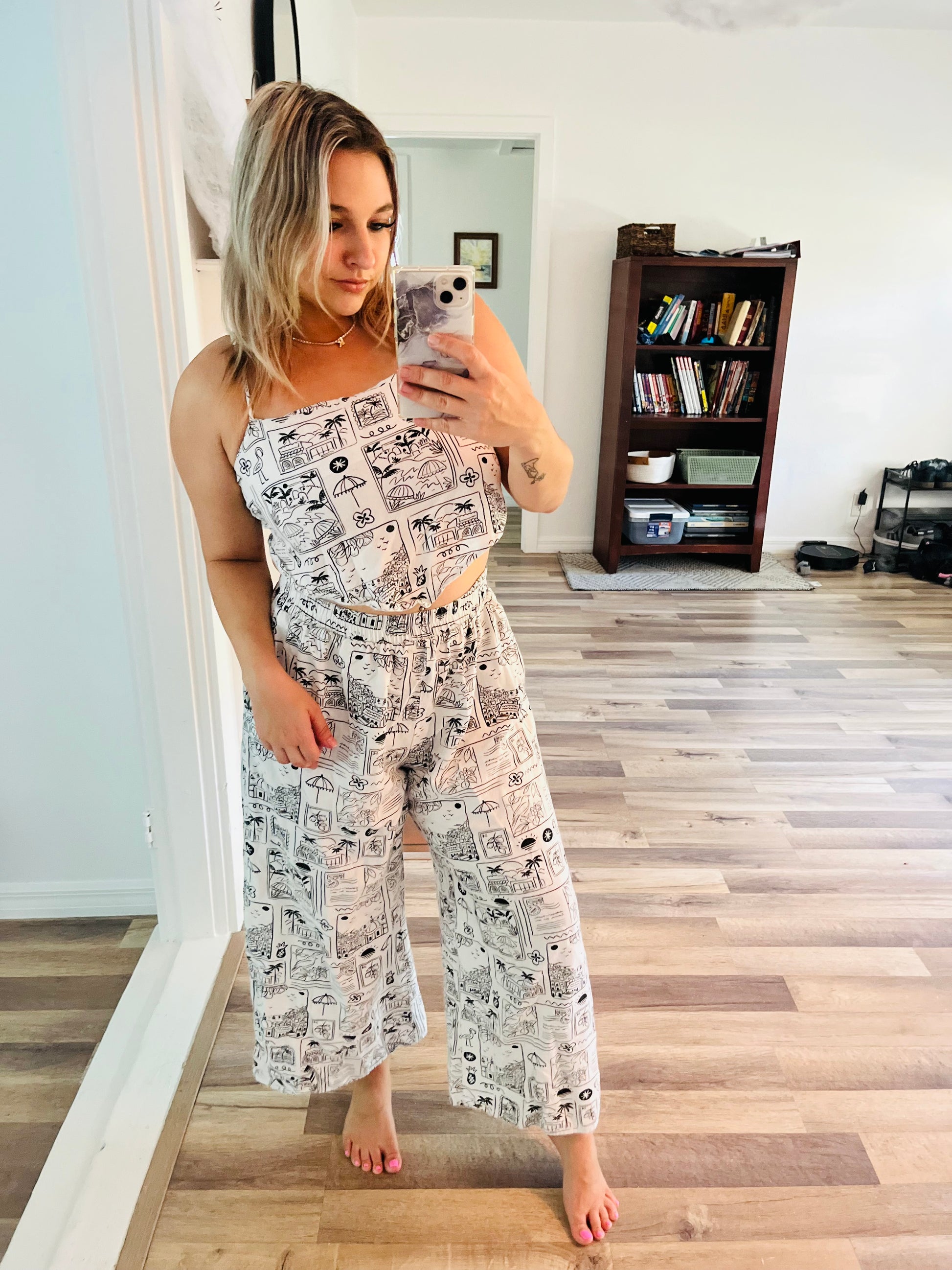 Details: Midnight Sky summer graphic set. This set comes with a cropped tank top with adjustable straps and a tie that ties in the back of the top and comes with pants ( they run on the shorter side) and they flare out as well. Size large! ( runs on the smaller side)