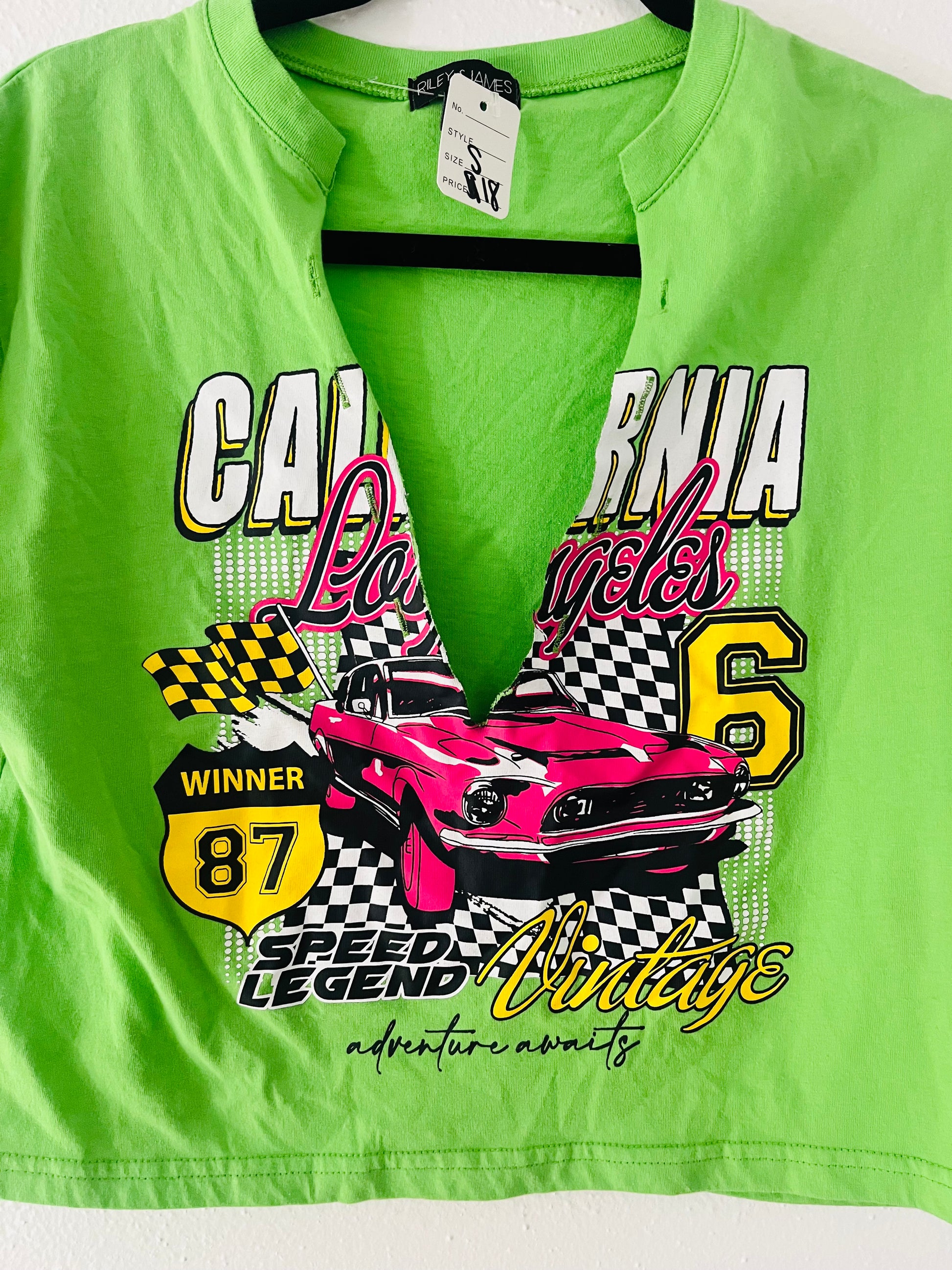 Details: Riley & James race car Lime green crop top with a v neck line. Super sexy yet causal look for any occasion. Size small! Fits true to size.